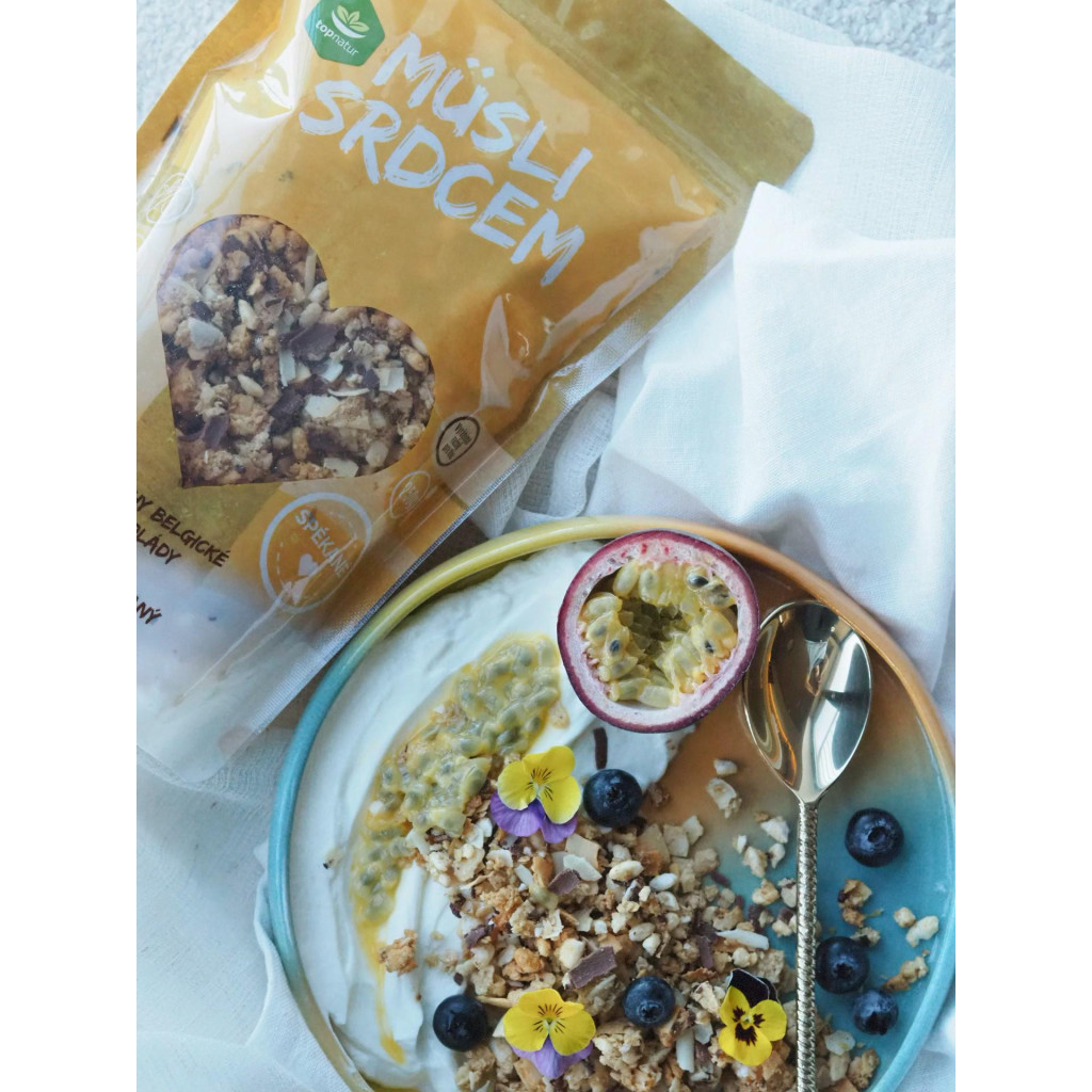 Sült müzli szívvel, pálmaolaj és tartósítószerek nélkül, de tele dióval és kókuszdióval kiegészítve, amely egész napra energiát ad.